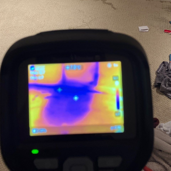 Thermal scans revealed temperature differences across the flooring and lower wall sections, confirming that moisture had migrated beyond the surface. Readings in the carpet and subfloor showed elevated saturation levels that required immediate removal and drying.