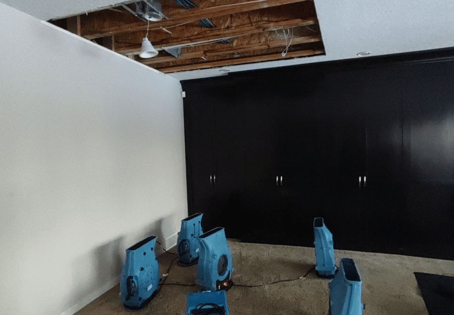 Commercial grade air movers and dehumidifiers were strategically placed across both levels of the property. Airflow was directed over exposed materials to accelerate evaporation, while dehumidifiers removed moisture from the air.